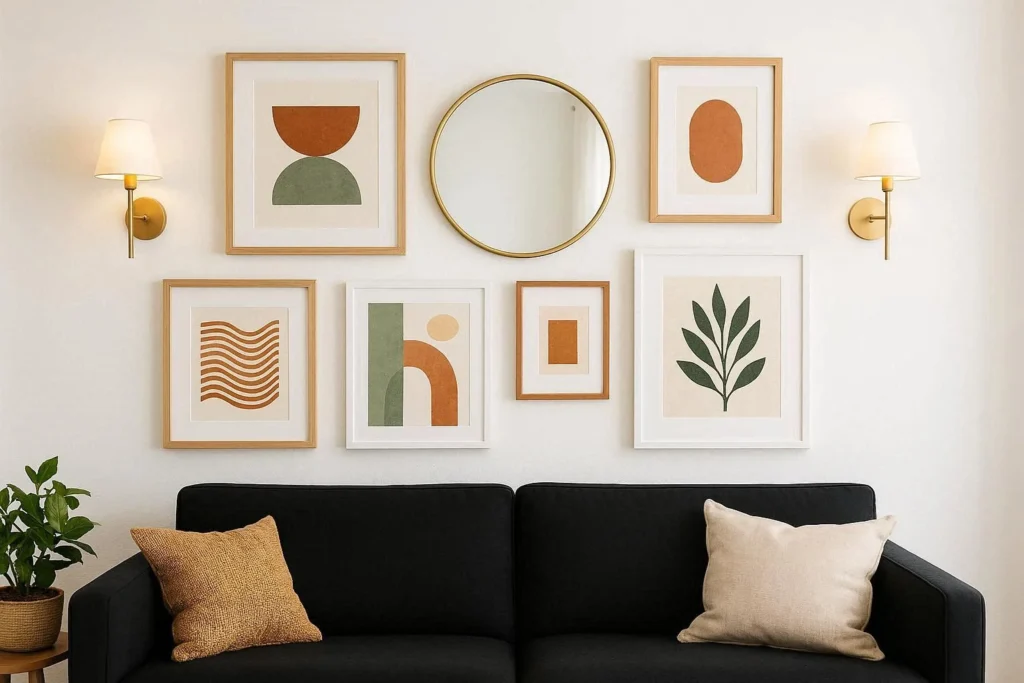The wall above a black sofa is prime real estate. A gallery wall with a mix of artwork, prints, and photos creates personality and draws the eye upward, lifting the whole room.